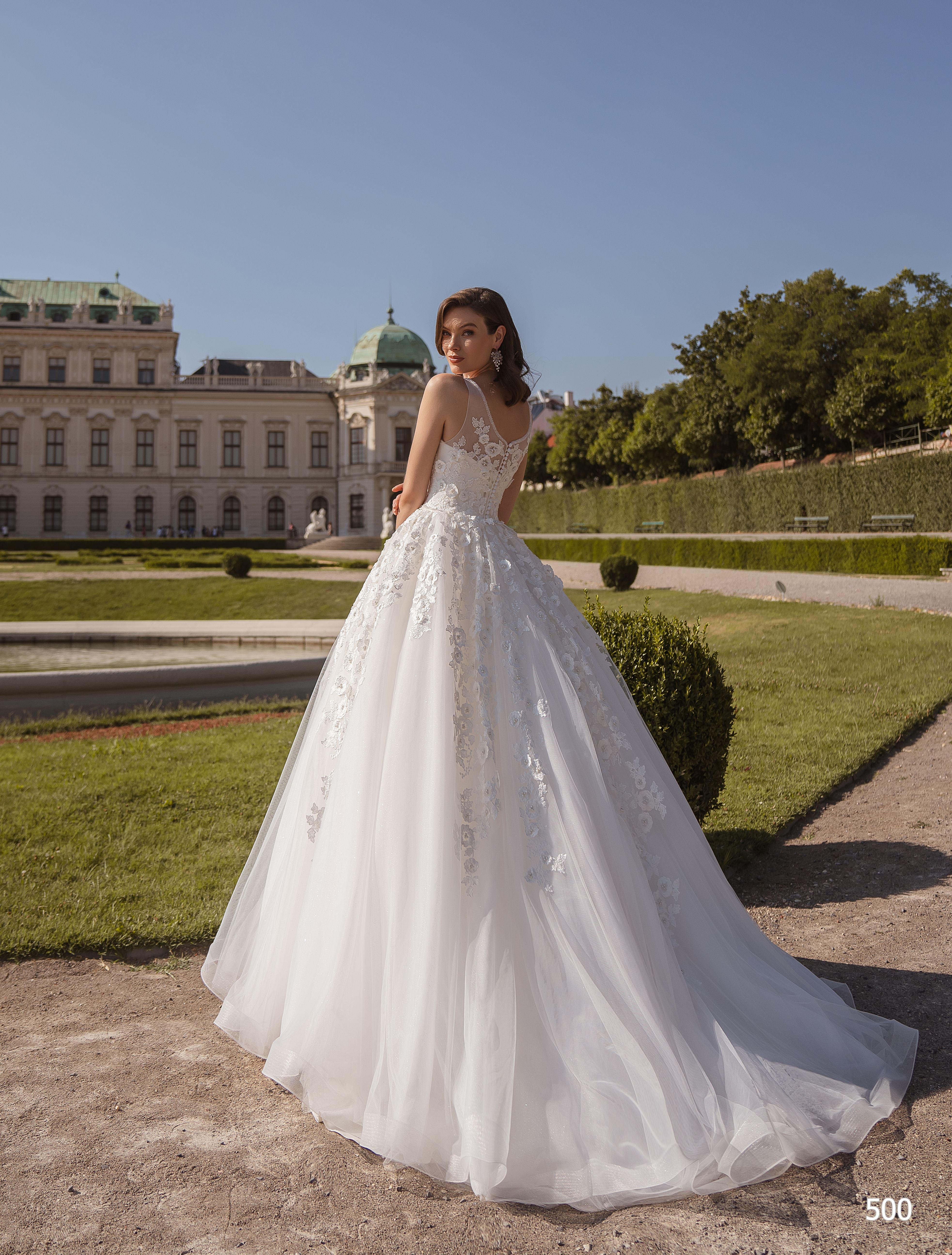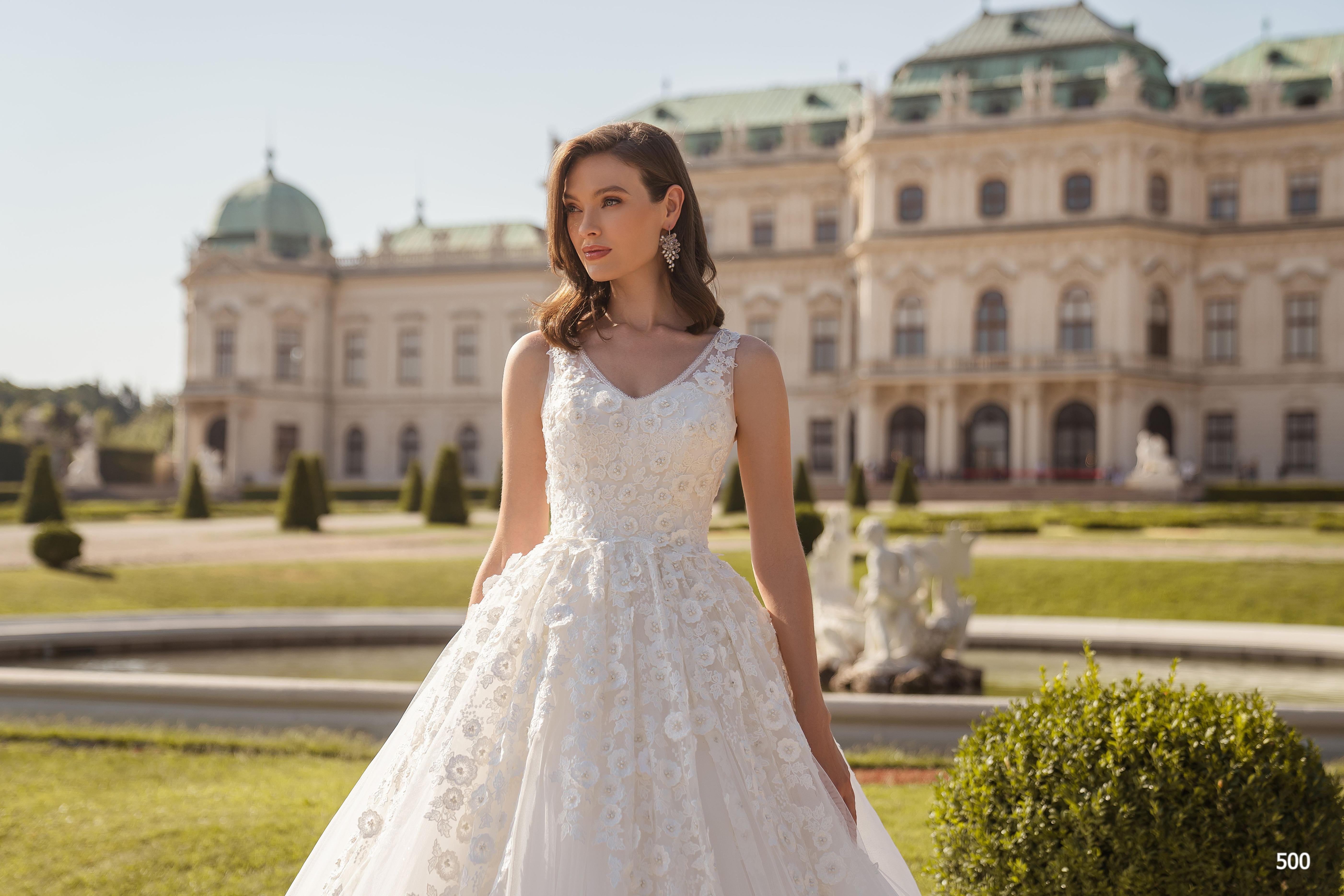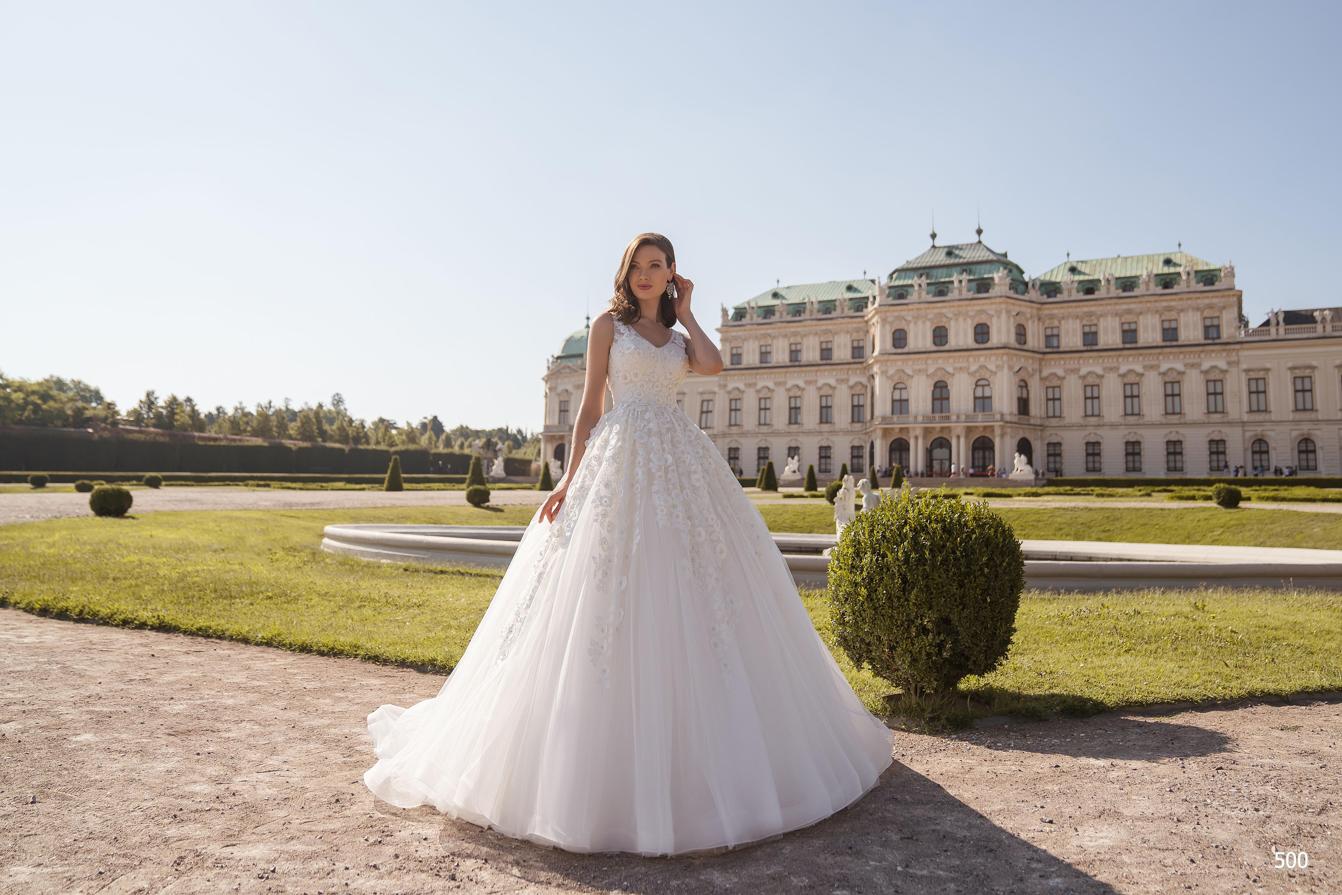 Cauti o rochie de mireasa printesa? Alege En 500, o rochie croita pentru printese moderne, cu dantela fina ce coboara de pe decolteu pe zona de fusta asemenea razelor alunginda silueta si oferind un puls de inaltime.